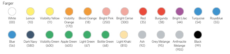 Materiale: 65 % Polyester, 35 % Bomull (Visibility Yellow [11] Visibility Orange [170] 85 % Polyester og 15 % Bomull)