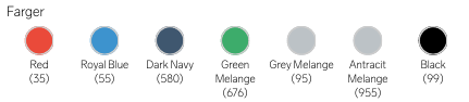 80 % Bomull, 20 % Polyester. (Antracit Melange [955] : 60 % Bomull, 40 % Polyester. Grey Melange [95] : 85 % Bomull, 15 % Viskose)