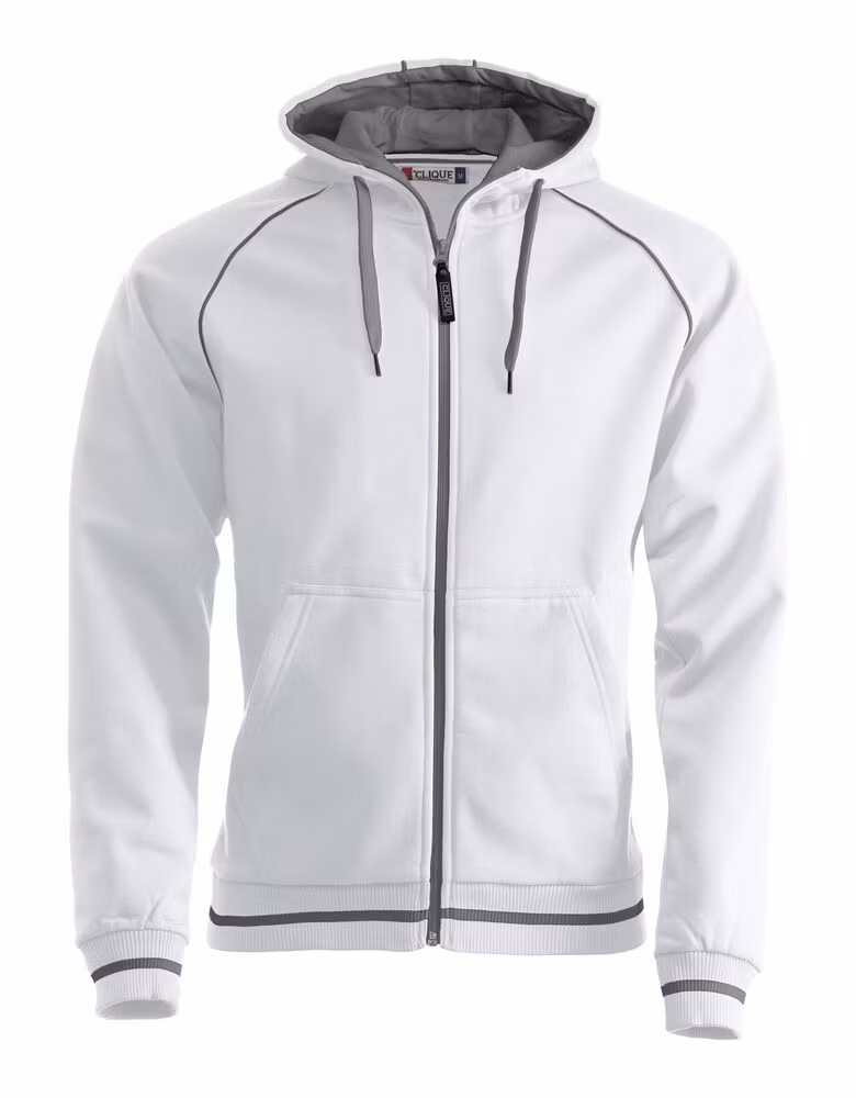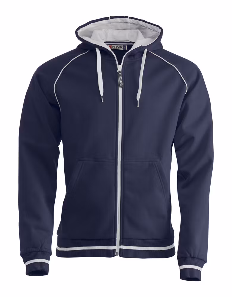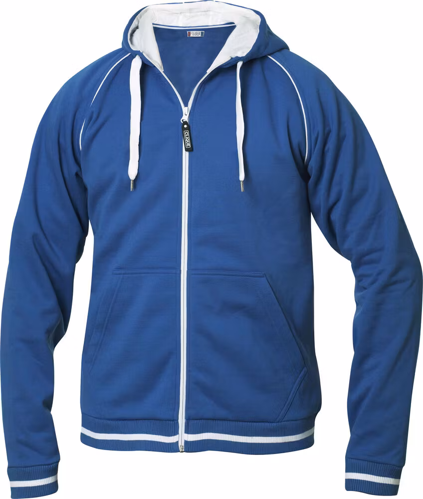 Sweatshirt jakke med hette til herre, børstet innside og strikket struktur på utsiden. Hette er med fõr og glidelås for dekorasjon. Kontrast farge på innside hette, piping, stripe på ribb og glidelås i front.Størrelser: XS-2XL