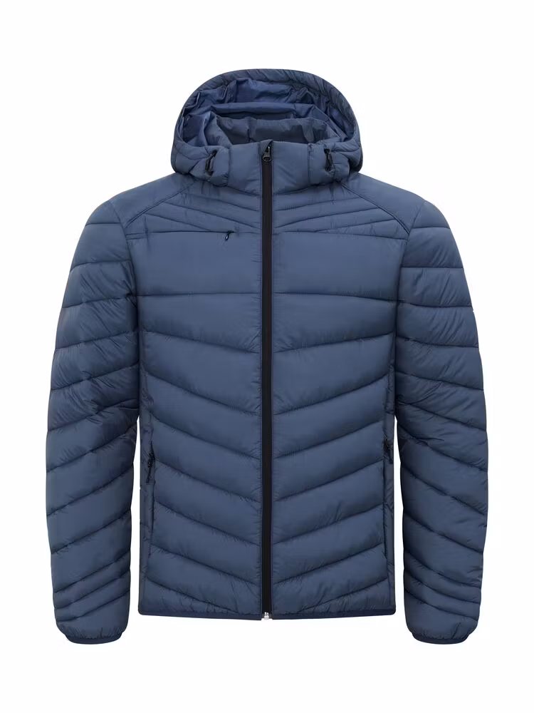 En varm, men likevel lett jakke med dunlignende vattering. Laget av 100 % resirkulert polyamid. Avtagbar hette, tre utvendige lommer med glidelås, og to innerlommer. Elastisk teip i nederkant og på ermeavslutningene. Leveres med farget stropp (til oppheng), øretelefonløsning og glidelåstrekkere.