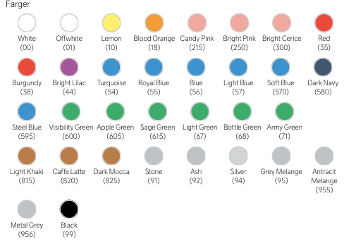 100 % Kjemmet Bomull. (Gråmelert [95] 85 % Bomull, 15 % Viskose. Aske [92] 99 % Bomull, 1 % Viskose. Antrasitt [955] 60 % Bomull, 40 % Polyester)