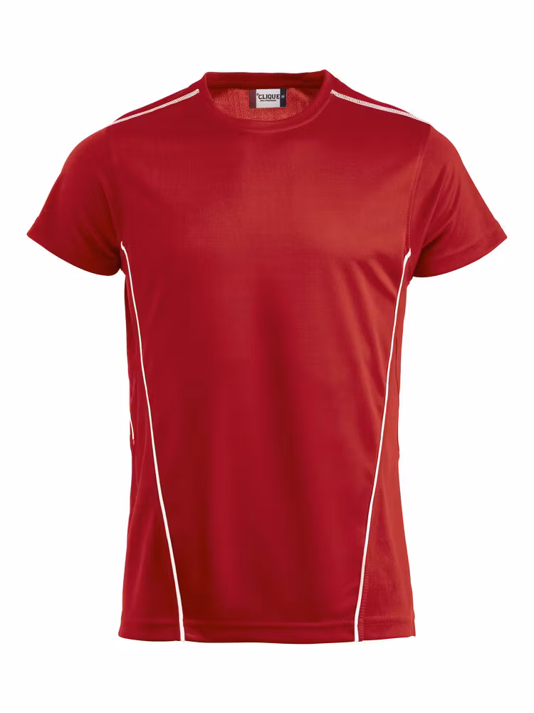 Unisex T-shirt i polyester, lett avrundet i nederkant, bånd i nakkesøm, ingen sidesømmer. Kontrast piping på sidene og overlock sømmer i kontrastfarge på skuldrene.