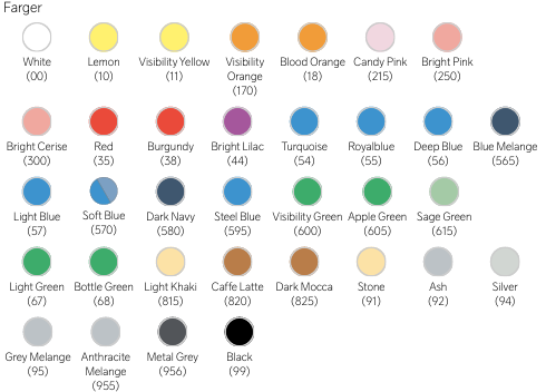 100 % Bomull (Visibility Yellow og Visibility Orange [11/170] 80 % Polyester, 20 % Bomull med sidesømmer. Ash [92] 99 % Bomull, 1 % Viskose. Grey Melange [95] 85 % Bomull, 15 % Polyester. Blue Melange og Anthracite Melange [565/955] 60 % Bomull, 40 % Polyester)
